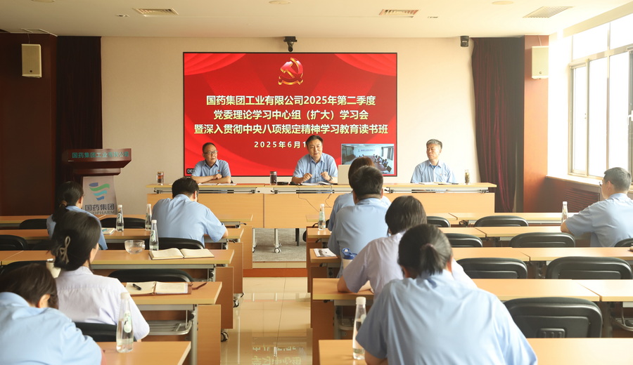 为进一步加强政治理论学习,强化思想理论武装,扎实推进深入贯彻中央八项规定精神学习教育,6月19日,国药工业党委召开2025年第二季度党委理论中心组(扩大)学习会暨深入贯彻中央八项规定精神学习教育读书班,国药工业党政班子成员、中层管理人员、各支部书记与委员、团总支书记与委员以及党群工作部工作人员参加了会议,党委书记、总经理刘统斌主持会议。